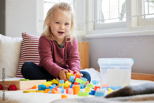 Little girl, portrait and toddler playing with blocks on bed for childhood development at home. Young child, kid or blonde female person with adorable, cute or innocent smile in joy for toys at house