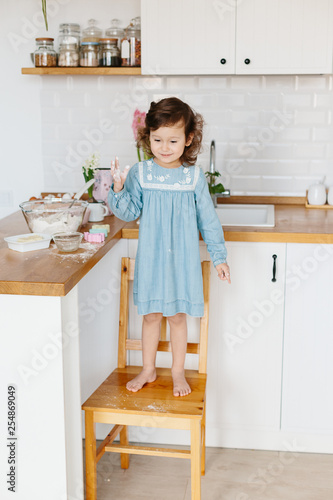 Little girl preparing easter cookies at the kitchen.