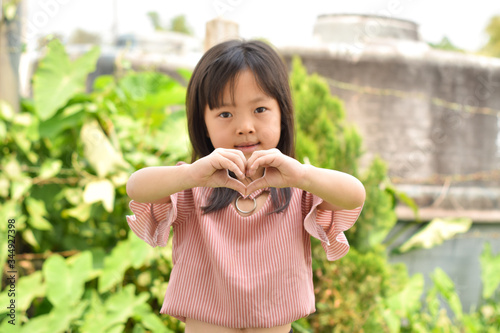 little girl showing a heart symbol in the park on summer day.