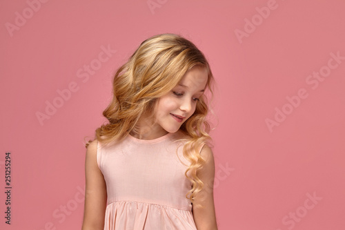 Little girl with a blond curly hair, in a pink dress is posing for the camera