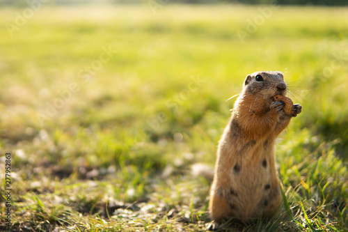 Little gopher gnaws peanut on a green field with unfocused backdrop. Ground squirrel holding peanut in it's paws. Copy space.