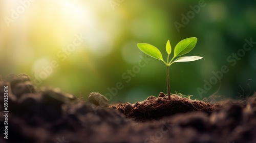 Little green sprouts appeared from the ground on a sunny spring day. Closeup of growing little green sprout appearing from the ground