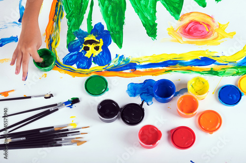 Little hand of kid learn to play colorful color on white paper