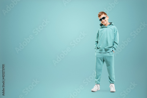 Little in a turquoise suit poses and fools around on a turquoise background, looks at the camera. Children's studio portrait. Childhood lifestyle concept.