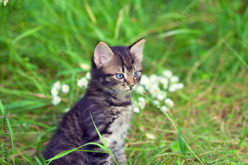 Little kitten sitting in the grass in summer