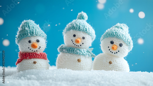Little knitted snowmen nestled in soft snow on a blue background.