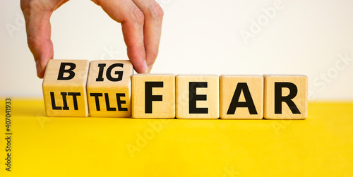 Little or big fear symbol. Hand turns wooden cubes and changes words 'little fear' to 'big fear'. Beautiful yellow table, white background, copy space. Business and fear concept.