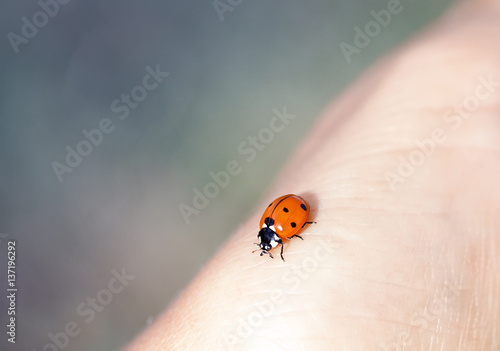 little red ladybug crawling on a human hand