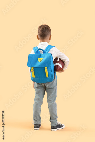 Little schoolboy with blue backpack and rugby ball on orange background, back view