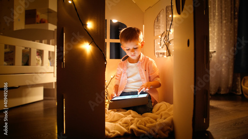 Little smart boy sitting in toy cardboard house and using tablet computer. Concept of child education and studying at night