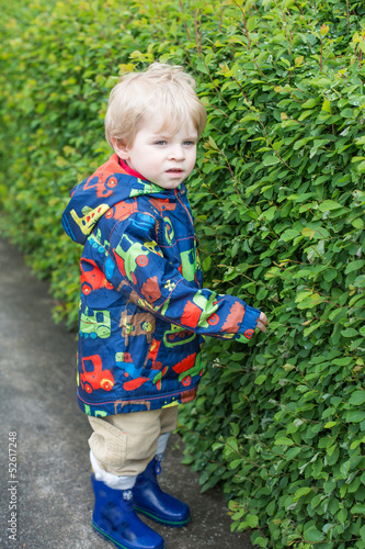 Little toddler boy in rain clothes, outdoors
