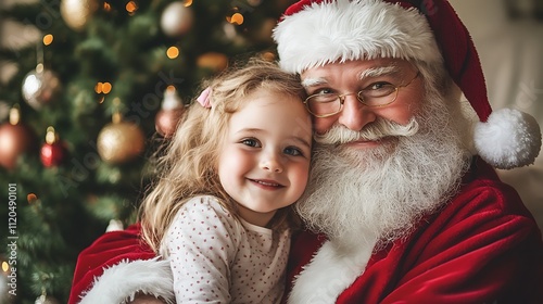 Little toddler sitting on Santa Claus's lap, with Father Christmas hugging the cheerful girl in front of a Christmas tree.