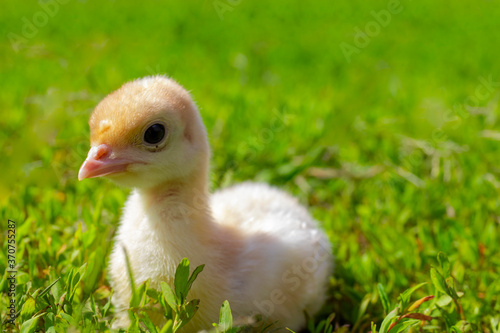 Little turkey on green grass. Turkey-poult close up. Turkey chick walking in the air. Eco farm