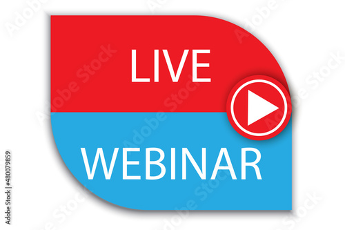 Live webinar emblem. Creative logo. Play button. Red and blue icon. Learning concept. Vector illustration. Stock image.