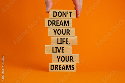 Live your dreams symbol. Wooden blocks with words Do not dream your life, live your dreams. Beautiful orange background. Businessman hand. Business and live your dreams concept. Copy space.