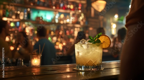 Lively Bar Scene with Beautifully Crafted Cocktail, Glimmering Bottles, and Packed Atmosphere in a Vibrant Nightlife Setting