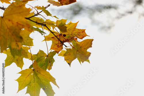 Lively closeup of falling autumn leaves with vibrant backlight from the setting sun