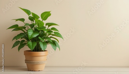 Lively Green Plant in Tan Pot Against Beige Wall - Natural Decor Mockup for Home Spaces