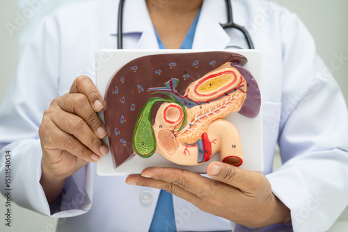 Liver with gallbladder, pancreas spleen and duodenum, Asian doctor holding human anatomy model for study diagnosis and treatment in hospital.
