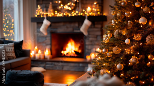 living room decorated for Christmas, warm yellow fairy lights, Christmas tree with ornaments, fireplace with stockings
