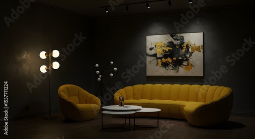 Living Room Interior Design Yellow Sofa, Dark Walls Moody Modern
