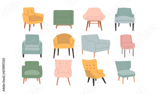 Living room interior flat style home elements set isolated on white background . Vector armchairs , different color and shapes ,pink, yellow , blue and green for different design uses .