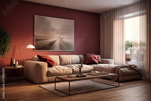 Living room interior in beige and burgundy colours with sofa, table and picture.