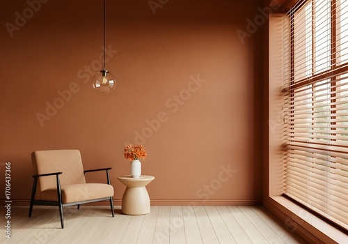 Living room interior in brown mocha mousse 2025 color with brown armchair and decor- 3D rendering
