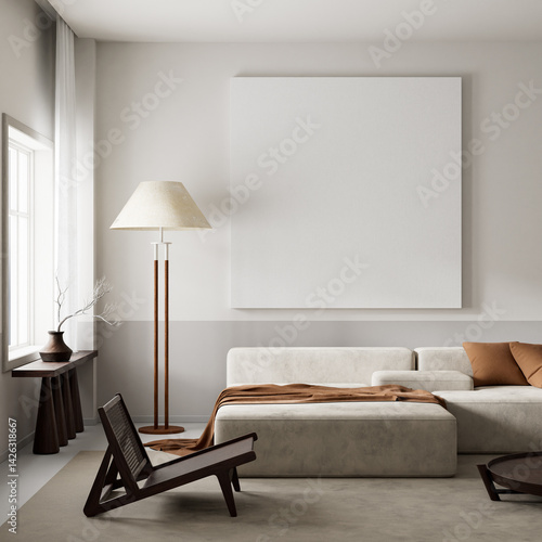 living room interior mock up with modern furnitures. Poster frame mock up in modern interior design. 3D illustration