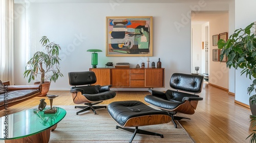 Living room with black chairs, a sideboard and art; indoor furniture, design, lifestyle