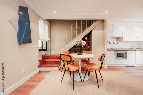 Living room with round white dining table with tobacco colored leatherette upholstered chairs, open plan kitchen with white cabinets and staircase to attic bedrooms