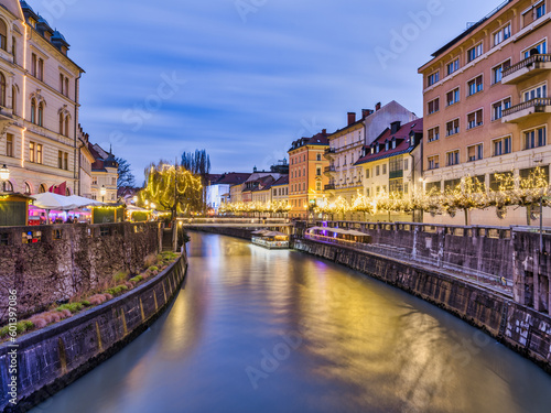Ljubljana River and river side old town lit up with Christmas lights at dusk, Slovenia