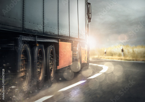 lkw fährt schnell zum ausliefern auf der straße mit sonnenstrahlen