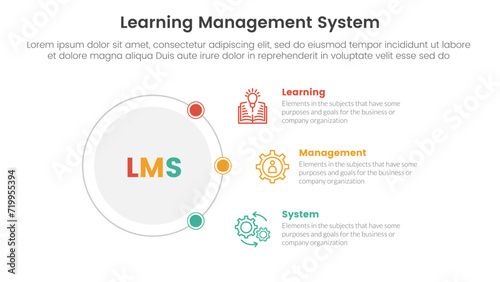 lms learning management system infographic 3 point stage template with outline circle connecting network content for slide presentation