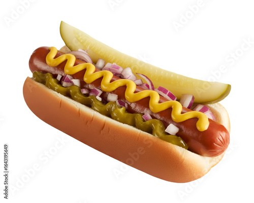 Loaded hot dog with toppings isolated on white background for street food and fast snack concept