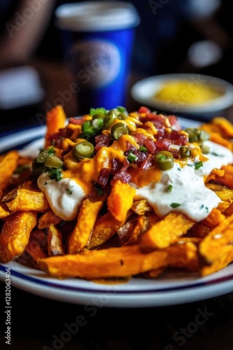 Loaded sweet potato fries with sour cream, cheese, and jalapenos