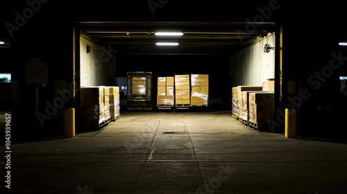 Loading dock with cargo at twilight, truck and warehouse scene