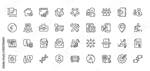 Loan house, Chemistry dna and Stars line icons pack. AI, Question and Answer, Map pin icons. Ranking, Attachment, Click hands web icon. Agreement document, Augmented reality, Repair pictogram. Vector