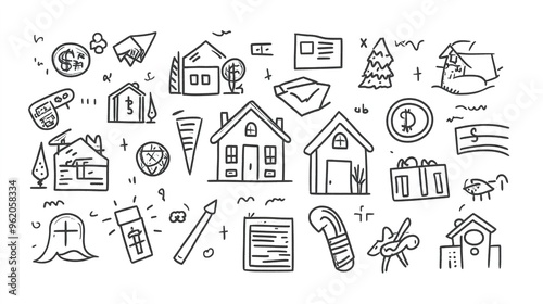 Loan interest rate doodle icon set. Hand drawn sketch doodle line style bank money loan interest rate icon for house, car discount percentage concept. Trendy cute element. Vector illustration