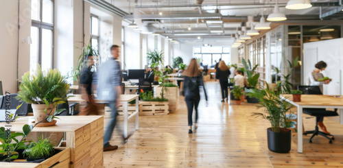 Lobby, busy and business people walk in office, company and startup with tech on wood desk. Blur, motion or group in coworking space for sustainability, workflow or workspace with eco friendly plants