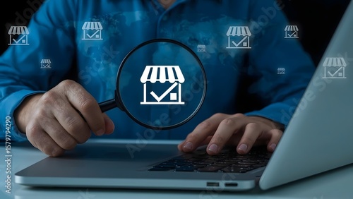 Local marketplace and e-commerce business concept. A person using a laptop with a magnifying glass focusing on a digital storefront, online marketplace, business growth, and e-commerce opportunities.