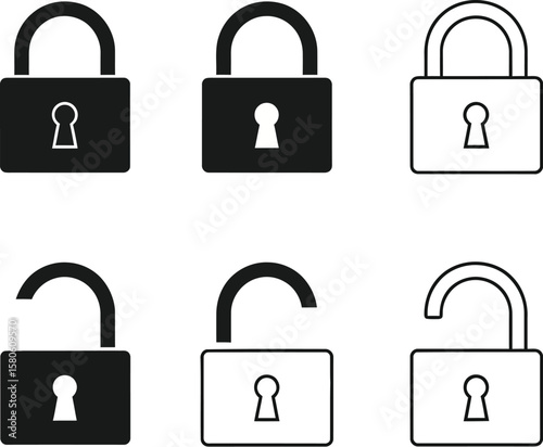 Lock & Unlock Icon Set – 6 Padlock Symbols in Solid, Circular Keyhole, and Outlined Styles for Security and Access Control