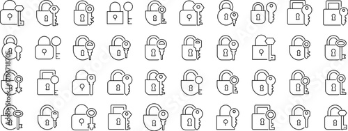 Lock and Key Line Icon Pack. Outline Signs for Graphic and Web Design, Apps, Adverts, Various Cards