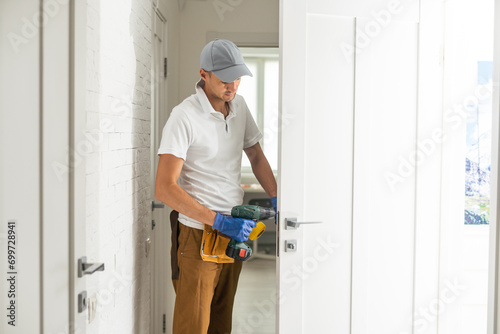 locksmith unscrew the door lock, locksmith repairs the lock in the front plastic door