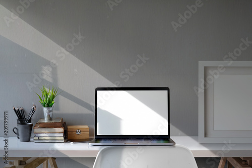 Loft workplace mockup poster with laptop, supplies and vintage books. Workspace and blank screen laptop.