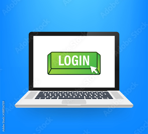 Login button laptop on blue background. Website template design. Click button. Vector stock illustration.