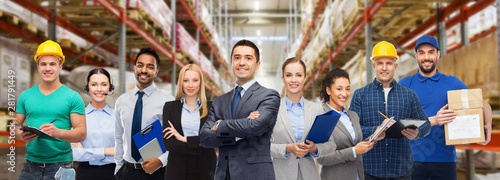 logistic business, delivery service and people concept - happy international team of employees over warehouse background