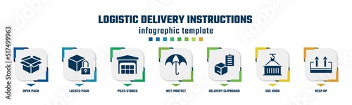 logistic delivery instructions concept infographic design template. included open pack, locked pack, piles stored, wet protect, delivery clipboard, use hook, keep up icons and 7 option or steps.