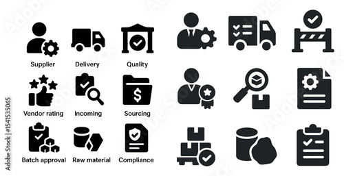 Logistics and supply chain solid icons set – delivery, vendor management symbols