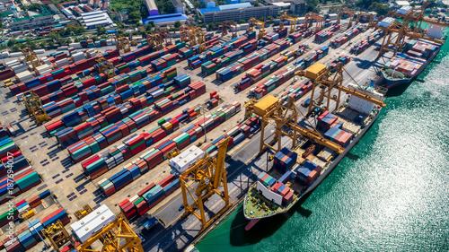 Logistics and transportation of Container Cargo ship and Cargo plane with working crane bridge in shipyard at sunrise, logistic import export and transport industry background